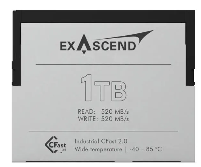 Az Exascend SD3X sorozatú 1 TB CFast 2.0 kártyaegy ipari szintű tárolási megoldás, amelyet olyan kritikus fontosságú alkalmazásokhoz terveztek, amelyek hatalmas kapacitást és tartós, nagy sebességű teljesítményt igényelnek, mint például a 8K RAW videofelvétel, a valós idejű megfigyelés és a beágyazott AI rendszerek. A 3D TLC NAND és a SATA III (6 Gb/s) interfésznek köszönhetően kiegyensúlyozott, tartós szekvenciális sebességet ér el , 520 MB/s olvasási és 520 MB/s írási sebességgel, így biztosítva, hogy ne legyenek szűk keresztmetszetek a folyamatos adatáramlás vagy a nagy fájlok átvitele során. Megbízhatóan működik 3,3 V feszültségen, -40 °C és +85 °C közötti szélsőséges hőmérsékleti tartományban. A kompakt CFast formátum (42,8 x 36,4 x 3,6 mm) illeszkedik a régebbi és a modern gazdagépekhez egyaránt.