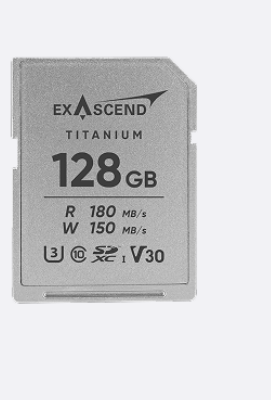 Az Exascend Titanium SDXC UHS-I V30 128 GB egy strapabíró, teljes egészében fémből készült memóriakártya professzionális 4K videók és nagysebességű fényképezéshez, amely 180 MB/s olvasási és 150 MB/s írási sebességet biztosít, valamint V30 tanúsítvánnyal rendelkezik a cseppmentes felvételekhez. 200 N-ig hajlításálló, hőelvezető, és életre szóló garanciával rendelkezik adat-helyreállítással, -25 °C és 85 °C közötti hőmérsékleti környezetben működik.