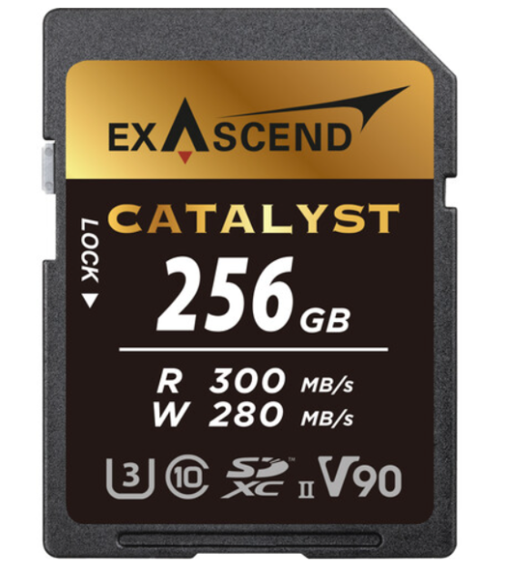 Az Exascend EX256GSDU2 256 GB Catalyst UHS-II SD-kártya 300 MB/s olvasási és 280 MB/s írási sebességet biztosít (V90 garantált ≥90 MB/s). A strapabíró, időjárásálló kialakítás -13 és 185 °F közötti hőmérsékletet, vizet és port is kibír, így ideális 8K/6K filmekhez és nagy bitrátájú fényképezéshez, nulla képkockaveszteséggel.
