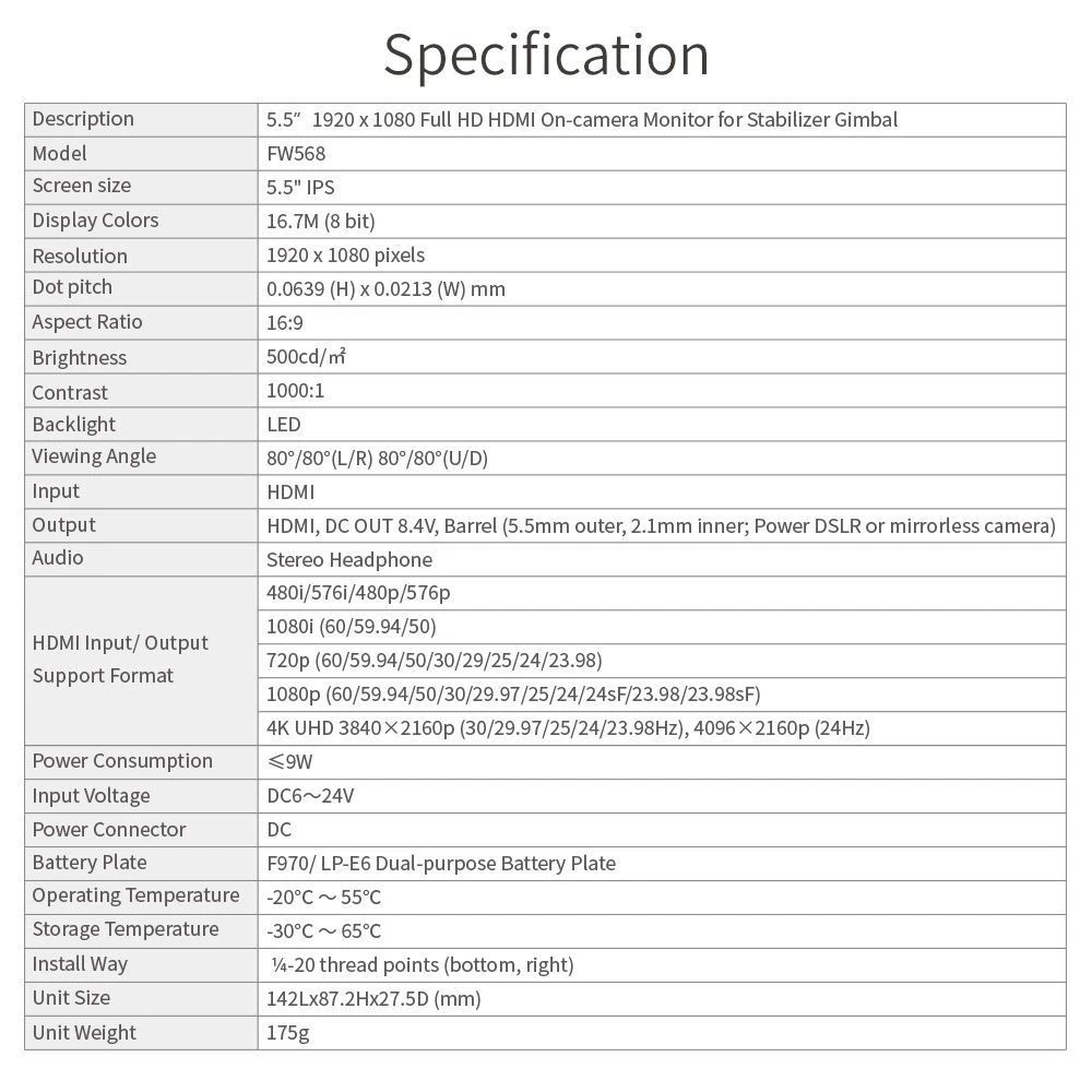A miniatűr, de nagy teljesítményű 5,5"-os kameramonitort kis DSLR/DSLM kamerákhoz tervezték, számos előnézeti funkcióval gazdagítva azokat, beleértve a hamis szín, a fókusz asszisztens, a pixelről pixelre történő fókuszálás, hanghallgatás, jelzések stb.