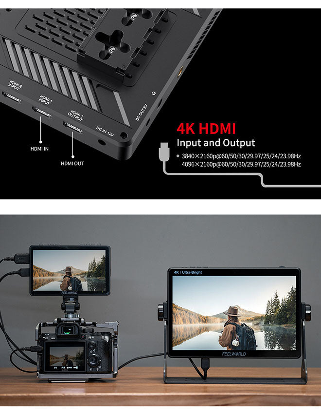 4K HDMI bemenet és kimenetA kettős HDMI jelbemenet könnyen illeszkedik a tükörreflexes kamerához és egy kimenethez, támogatja a 4K@60Hz-ig terjedő, veszteség nélküli átvitelt, és a képernyő simább és tisztább. És 3,5 mm-es fejhallgató-csatlakozót biztosít a hang monitorozásához.