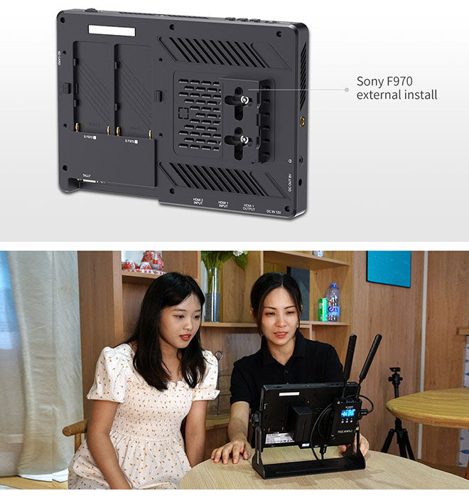 A Sony F970 külső telepítő- és tápellátó készlet kialakítása a monitor hátoldalán található. A külső készletet a külső berendezések, például a vezeték nélküli átvitel, a LED-fény, a videokonverter és egyéb, a Sony F970 akkumulátoráról táplálható külső berendezések telepítéséhez és telepítéséhez használhatja. Ez az innovatív külső tápegység kialakítása megfelel a külső vezeték nélküli átvitel, a LED-fény és más berendezések tápellátásának igényének, nagymértékben megtakarítva a berendezések által elfoglalt helyet és csökkentve a fotófelszerelés súlyát.