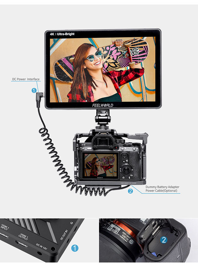 A LUT11H nem csak DC IN 12V (12/3A adapter használatára alkalmas), hanem kiegészítő tápkimenetet is biztosít (DC OUT 8V), amely lehetővé teszi a fotósok számára a fényképezőgépek tápellátását. Az akkumulátor adapterkábellel (opcionális) a LUT11H meghosszabbítja a fényképezőgép üzemidejét, miközben használhatóbb kijelzőt biztosít.