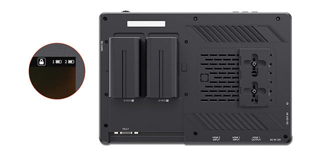 A LUT11H monitor hátoldalán kettős akkumulátorlemez található, két szabványos NP-F akkumulátor telepítésére alkalmas, hosszan tartó áramellátást biztosít a képernyő számára. Ezenkívül gyorsan cserélheti az akkumulátort, csak duplán koppintson a monitor jobb felső sarkában lévő akkumulátor ikonra körülbelül 3 másodpercig a váltás befejezéséhez, és ne aggódjon a monitorozás megszakítása miatt. Egy F970 akkumulátor (6600mah) telepítése körülbelül 2 órán át tart, két F970 akkumulátor telepítése pedig körülbelül 3,5-4 órán át tart. Választhat 1 vagy 2 akkumulátor telepítését az Ön igényei szerint.