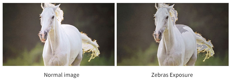 Az expozíciót a Zebramintás üzemmódban az expozíció beállításának segédeszközeként használják. Túlexponáltnak minősül, és mozgó figyelmeztető vonalakat jelenít meg a túlexponált területen. Van egy 1-100% közötti zebraérték, amelyet be lehet állítani.