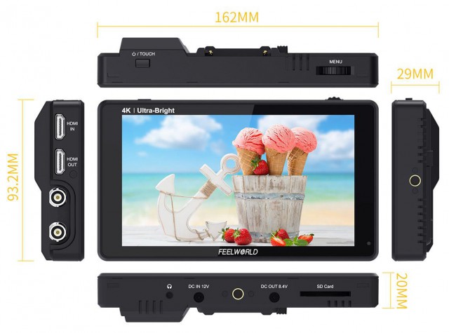 6" nagy fényerejű (2600 cd/m²) kameramonitor érintőképernyővel és 3D LUT korrekció támogatással (integrált HLG 2020, HLG 709, HLG P3 HDR 3D LUT és Rec709 De-slog3/SLog2, SLog3, LogC, V-Log előbeállítások; vagy akár 50 saját LUT fájl importálása SD kártyán keresztül). LUT-okkal, LUT-okkal, LUT-okkal és LUT-okkal, amelyek több LUT-ot tartalmaznak. Mini/Micro HDMI-HDMI kábel és rögzítőkonzol. LUT6S változat 4K HDMI és 3G-SDI I/O-val.