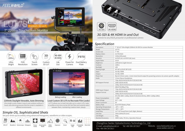 7"-os kameramonitor nagy fényerővel (2200 cd/m², beleértve a környezeti fényérzékelőt az automatikus fényerő-beállításhoz), érintőképernyővel és 3D LUT korrekciók támogatásával (integrált "Log to Rec.709" előbeállítás vagy egyéni .cube fájlok importálása). Egy sor "Retrofit" fájlt tartalmaz. Mini/Micro HDMI-HDMI kábel és rögzítőkonzol. LUT7S változat 4K HDMI és 3G-SDI I/O-val.