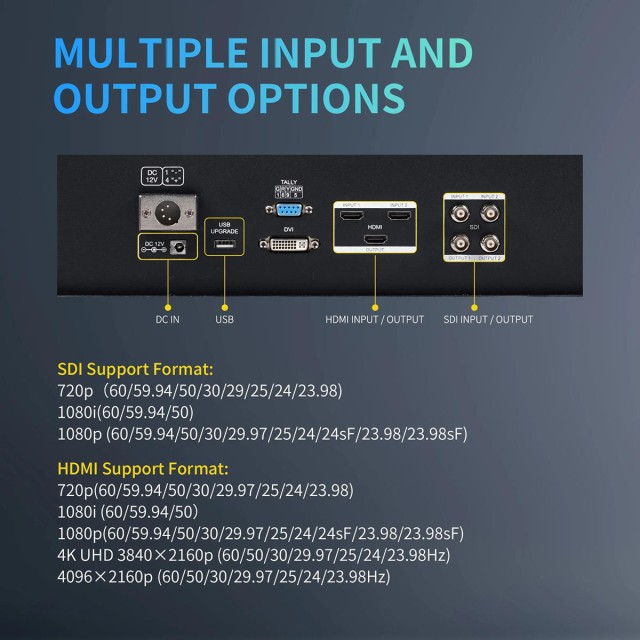 A 3G-SDI, HDMI2.0 és DVI portokkal felszerelt monitor kompatibilis a professzionális videokamerákkal és a legújabb digitális tükör nélküli fényképezőgépekkel.