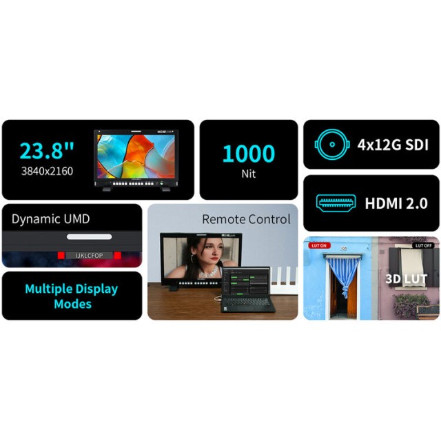 A FeelWorld S24 egy kompakt, nagy teljesítményű, 23,8 hüvelykes UHD 4K monitor, amelyet professzionális videóprodukcióhoz, sugárzáshoz és utómunkához terveztek. 3840×2160 IPS LCD panelje 1000 cd/m² fényerőt, 1300:1 kontrasztarányt és 98,7% DCI-P3 széles színskálát biztosít a pontos, élénk képvisszaadáshoz. A többkamerás felállásokhoz tervezett monitor négy 12G-SDI bemenetet és kimenetet támogat UHD 4K60 és quad-link 8K esetén, valamint HDMI I/O-t DCI 4K60 esetén.