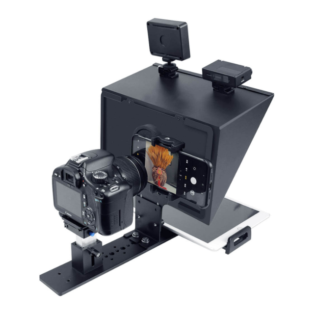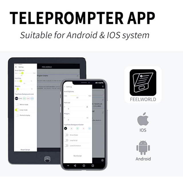 Az univerzális Feelworld TP13A teleprompter/súgógép támogatja az okostelefonos/tabletes hasznmálatot (11"-ig támogatja a táblagépeket) és az okostelefonos/DSLR/DSLM felvételeket a jól átgondolt rögzítőknek, valamint az állítható tartónak (6 cm-ig) köszönhetően. Ezen kívül rendelkezik levehető szövet napellenzővel, habgyűrűkkel és Bluetooth távirányítóval, amely kommunikál a Feelworld Android/iOS alkalmazásokkal.