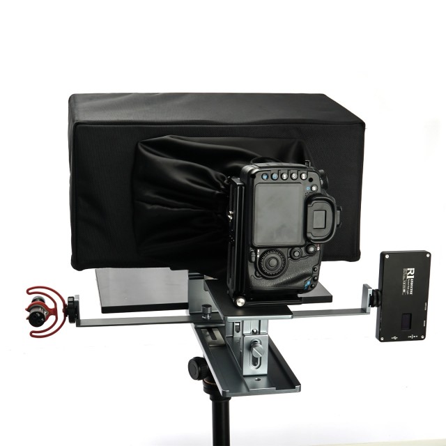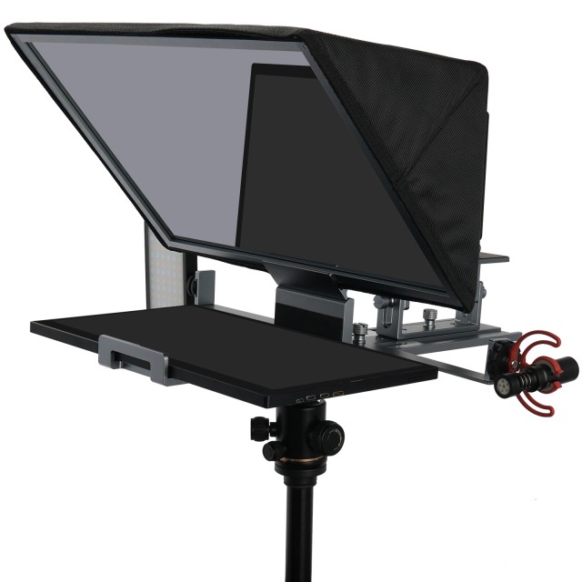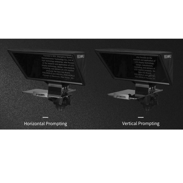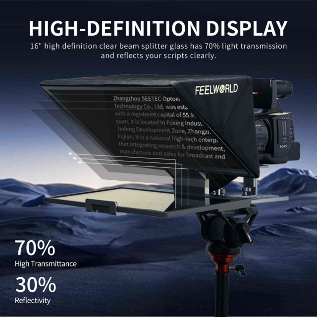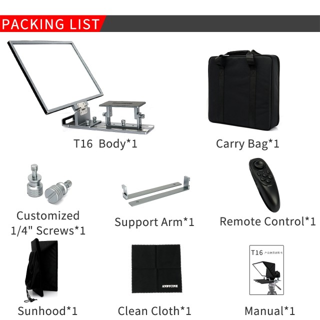 Feelworld/ANDYCINE T16 egy 16 hüvelykes hordozható, összecsukható teleprompter alumínium testtel, levehető textil árnyékolóval, amely kompatibilis DSLR kamerákkal és okostelefonokkal, távirányítóval és APP (Android és IOS) vezérléssel.