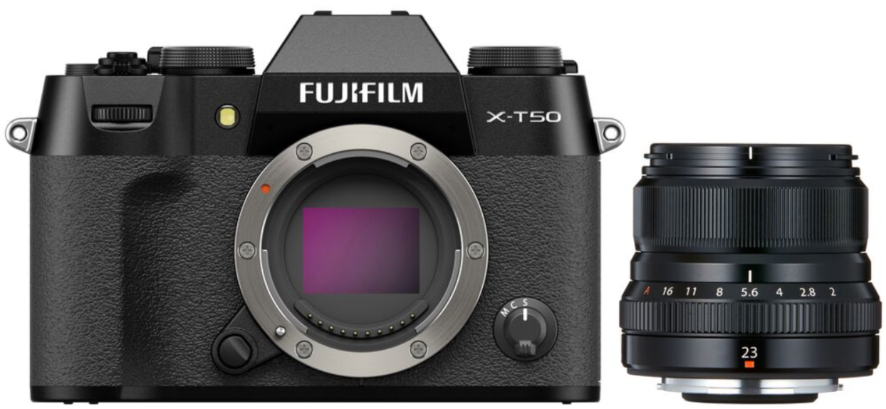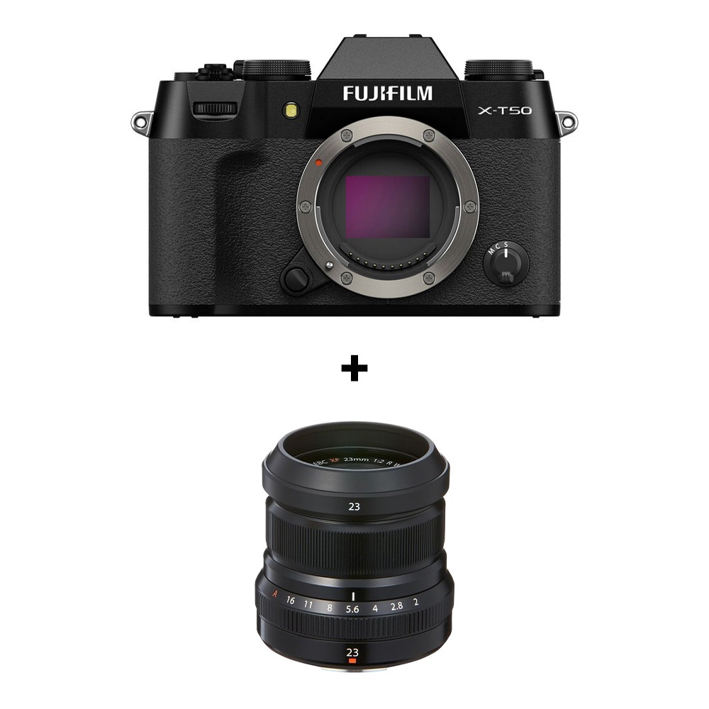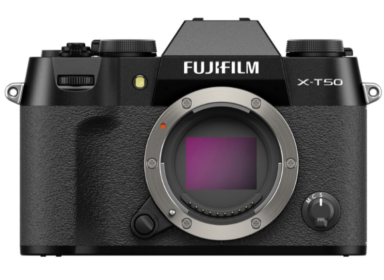 A Fujifilm X-T50 Black egy kompakt, tükör nélküli APS-C fényképezőgép, 40,2 MP-es X-Trans CMOS 5 HR érzékelővel, X-Processor 5 processzorral, 6,2K/30p open-gate videóval, speciális film szimulációs kerékkel 20 üzemmóddal (beleértve a REALA ACE-t), AI objektumfelismerő AF (425 pont, -7 EV), elektronikus zár 1/180 000 s-ig, 7 fokozatú, 5 tengelyes IBIS képstabilizálás, 2,36 M-dot EVF, 3" 1,84 M-dot vari-angle érintőképernyő, súlya 438 g akkumulátorral – ideális retro stílusú, nagy felbontású fotók és videók készítéséhez.
