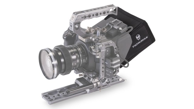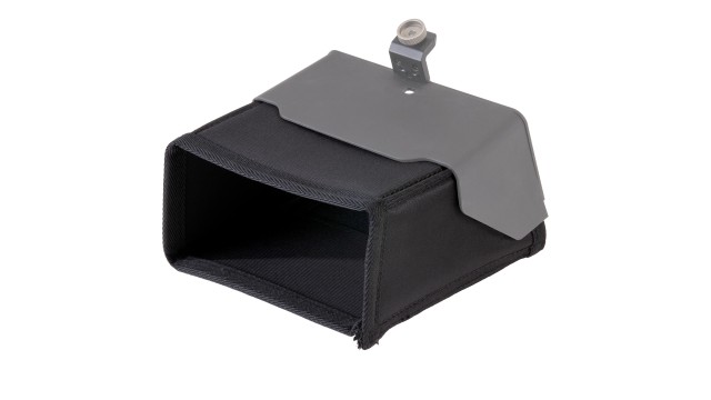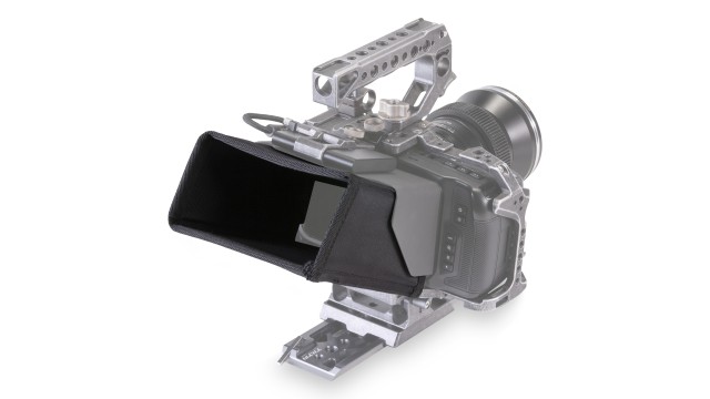A teljes napellenző a BMPCC 4K részleges napellenzőhöz a mellékelt tépőzáras rögzítőkkel csatlakoztatható. Ez nagyobb napellenző lefedettséget biztosít. A teljes napellenző alján található rekesz kinyitható, hogy hozzáférjen a fényképezőgép érintőképernyőjéhez.