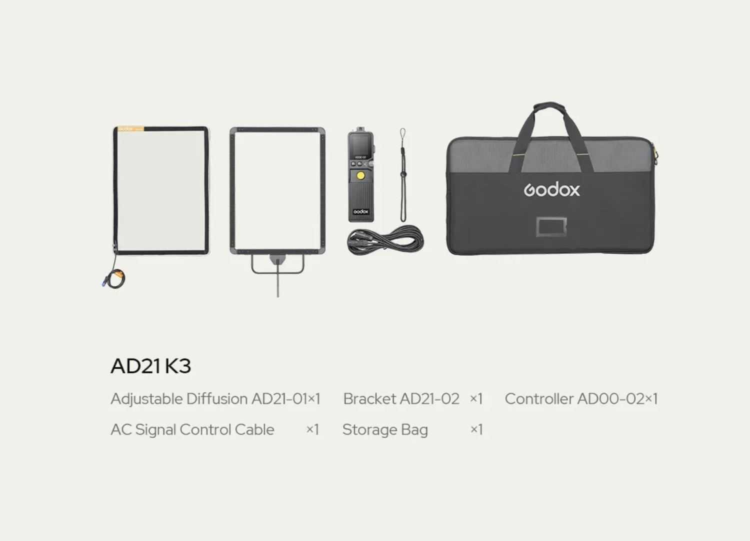 A Godox Knowled AD21 K3 állítható diffúzor készlet elektronikusan vezérelt, motoros diffúziót biztosít, sima átmenettel a keménytől az ultra-lágy fényig. Kettős vezérlési módokkal, villódzásmentes teljesítménnyel 300 fps-ig, többféle tápellátási lehetőséggel és széles körű kompatibilitással Bluetooth, DMX és beépített vezérlők révén ez egy hordozható, összecsukható megoldás a pontos, forgatáson történő világítás finomításához.