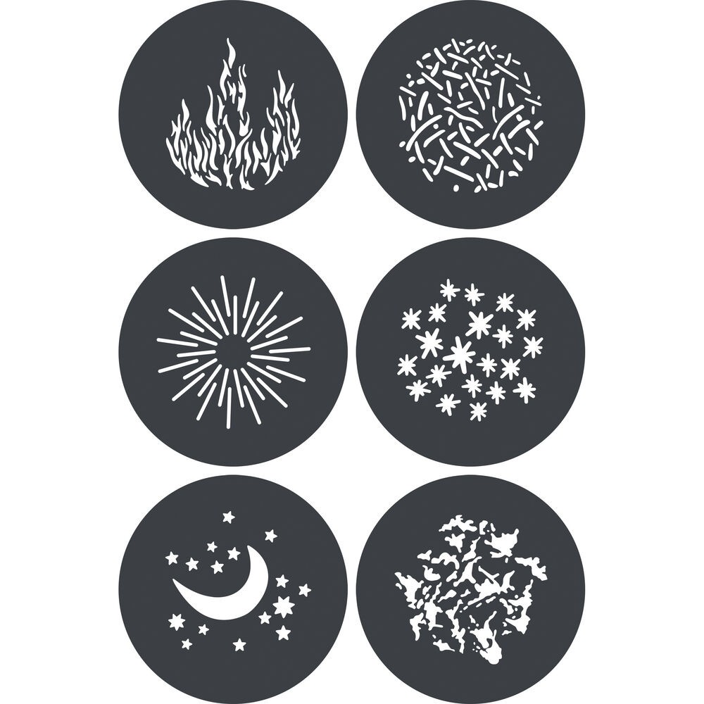 A Godox Knowled GP-GS1 GOBO készlet hat darab 148 mm-es acél gobót tartalmaz , amelyeket az MG1200Bi Spotlight Mount számára terveztek, és amelyek lehetővé teszik kreatív minták, például tűz, csillagok, hold és széteső textúrák vetítését – tökéletesek színházi, film-, videó- és divatalkalmazásokhoz.