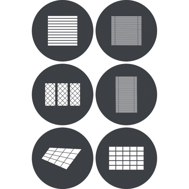 A Godox Knowled GP-GS4 GOBO készlet hat 148 mm-es acél gobót tartalmaz, amelyeket az MG1200Bi Spotlight Attachment kiegészítőhöz terveztek, és amelyek számos mintát kínálnak kreatív vetítéshez színházban, filmekben, divatban vagy fotózásban.