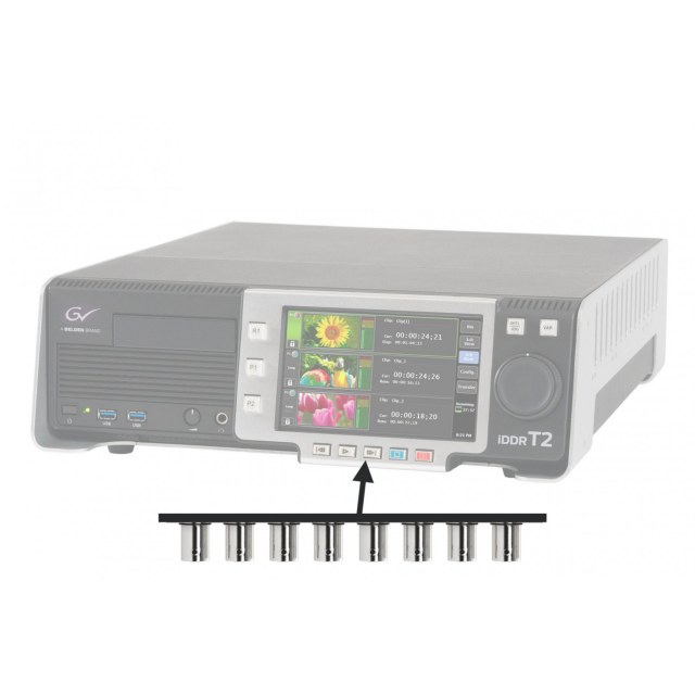 Opcionális kiegészítő a Grass Valley T2 iDDR 4K lemezfelvevő/lejátszó készülékekhez 8x SDI interfésszel, amely lehetővé teszi a bemenetek/kimenetek egyidejű csatlakoztatását Quad-Link SDI módban. A felvevővel együtt kell megrendelni.