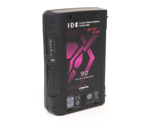 A kompakt (97x146x39 mm, 610 g) IDX CUE-H90 V-Mount akkumulátor 90 Wh (14,8 V, 6,02 Ah) kapacitással 7A/85W-ig bírja, emellett 80W-os D-Tap kimenetet (szabályozatlan), állapotjelző LED-et, nagy mechanikai és elektromos ellenállást, valamint teljes kompatibilitást kínál az ENDURA V-Mount tartozékokkal és töltőkkel.