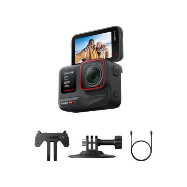 Magán az Insta360 Ace Pro kamerán kívül kapsz egy 1650 mAh-s akkumulátort, egy szabványos rögzítőt, egy rugalmas öntapadós rögzítőt és egy USB-C kábelt a csatlakoztatáshoz.