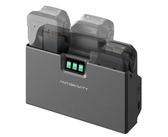 A hub power bankként is működik, így a terepen is feltöltheti telefonját, távirányítóját vagy más USB-C eszközöket. Könnyű és kompakt (133 × 36,8 × 93 mm, 117 g), így könnyen elfér egy hátizsákban vagy felszereléses táskában. USB-C PD/PPS támogatással, egymást követő töltéssel és hordozható áramforrásként való használat lehetőségével ez a töltő hub egyszerűsíti az akkumulátorok kezelését és biztosítja az Antigravity A1 drón maximális repülésre való készenlétét.