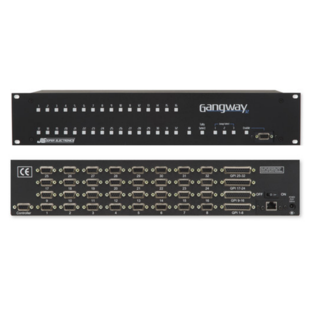 A GangWay32 32 portos RS-422 Gang Roll Switcher és GPI Trigger Box a JLCooper-től olyan előlapi fedélzeti vezérlőket kínál, amelyekkel egyszerre akár 32 VTR, DDR vagy szervercsatorna is kiválasztható. Az előlapon megvilágított gombok találhatók az egyes gépek állapotának egyértelmű jelzésére, és egy előlapi RS-422 port biztosítja a kényelmes távoli csatlakozást. A hátsó panel tartalmazza a 32 RS-422 portot, egy RS-422 vezérlőbemenetet és GPI (általános célú interfész) portokat.