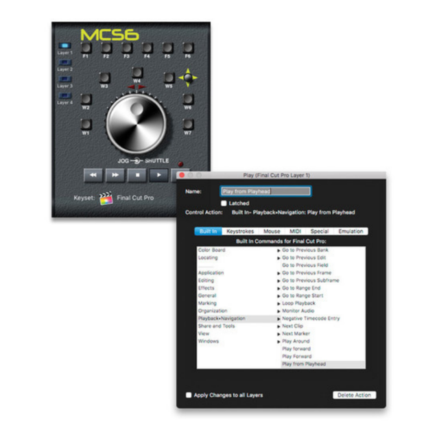 A JLCooper MCS6 USB Media Control Station bármilyen Mac szoftverrel működik, és lehetővé teszi a mellékelt billentyűkészletek használatát és testreszabását olyan alkalmazások fejlett vezérléséhez, mint a Final Cut Pro X, iMovie, Premiere Pro, Pro Tools, Nuendo, Vegas Video és Media Composer. Professzionális transzportgombokkal rendelkezik a felvétel, lejátszás, leállítás, gyors előretekerés és visszatekerés funkciókhoz. Ez a médiaállomás V/Stick navigációs vezérléssel is rendelkezik, és 18 fizikai gombbal rendelkezik a különböző szerkesztési funkciókhoz. A koncentrikus ingagyűrűvel ellátott, precíziós, optikailag kódolt kocogókerék lehetővé teszi az audio vagy videó képkocka-pontosságú vezérlését.
