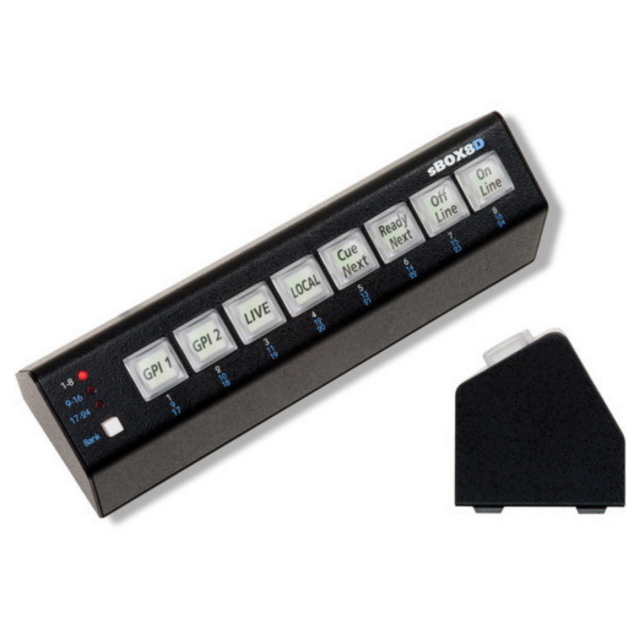 A Remote Trigger for gBox és eBox asztali változata az sBOX-ot a gBOX (GPO Trigger Box) vagy az eBOX (Quad Serial/Ethernet/GPI Interface) egyszerű, relegálható távvezérlőként csatlakoztatja a GPO események kiváltásához. Ezenkívül az eBOX-szel ezt az egységet használhatja a felhasználó által programozott soros vagy Ethernet üzenetek küldésének kiváltására. Ez a távirányító 8 LED háttérvilágítású gombbal és egy megvilágított bankkapcsolóval rendelkezik, amely lehetővé teszi, hogy egyetlen sBOX8D távirányítóval akár 24 GPO-t is vezérelhessen. Több sBOX8D távvezérlő egység (legfeljebb 3) akár 24 GPO-nak dedikált gombot is biztosíthat. Ez a kompakt egység a számítógép billentyűzete mögött helyezhető el.