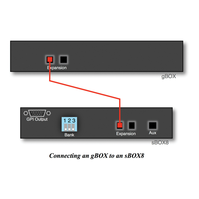 A Remote Trigger for gBox és eBox rack verziója az sBOX-ot a gBOX (GPO Trigger Box) vagy az eBOX (Quad Serial/Ethernet/GPI Interface) egyszerű, relegálható távirányítóként csatlakoztatja a GPO események kiváltásához. Ezenkívül az eBOX-szel ezt az egységet használhatja a felhasználó által programozott soros vagy Ethernet üzenetek küldésének kiváltására. Ez a távirányító 8 LED háttérvilágítású gombot és egy megvilágított bankkapcsolót tartalmaz, amely lehetővé teszi, hogy egyetlen távirányítóval akár 24 GPO-t is vezérelhessen. Több távvezérlő egység (legfeljebb 3) akár 24 GPO-hoz is biztosíthat dedikált gombokat. Ez a kompakt egység a számítógép billentyűzete mögött helyezhető el.