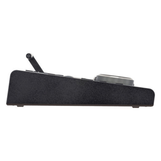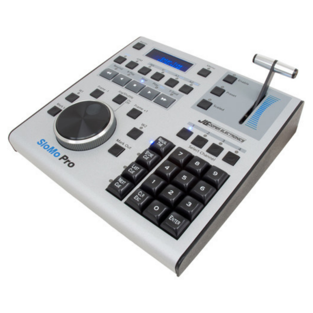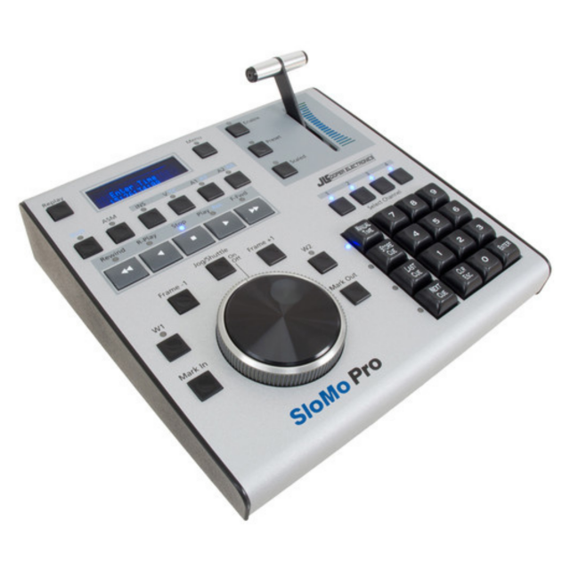 A SloMoPro™ USB professzionális szállítási gombokkal, a JLC egyedi, optikailag kódolt, shuttle gyűrűvel ellátott görgetőkerékkel, kiváló minőségű T-Barral a slomóhoz, könnyen leolvasható 2 x 16 VF kijelzővel, teljes méretű numerikus billentyűzettel és gyorsan elérhető funkciógombokkal rendelkezik.
