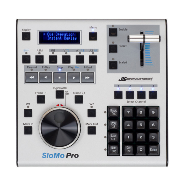 A JLCooper új SloMoPro™ USB az ES-SloMo következő generációs változata (az ES-SloMo J USB közvetlen helyettesítője), frissített megjelenéssel és elegáns, alacsony profilú házzal. A kompakt burkolat 20%-kal kisebb asztali alapterületet biztosít ugyanolyan kezelőszervek és távolságok mellett.