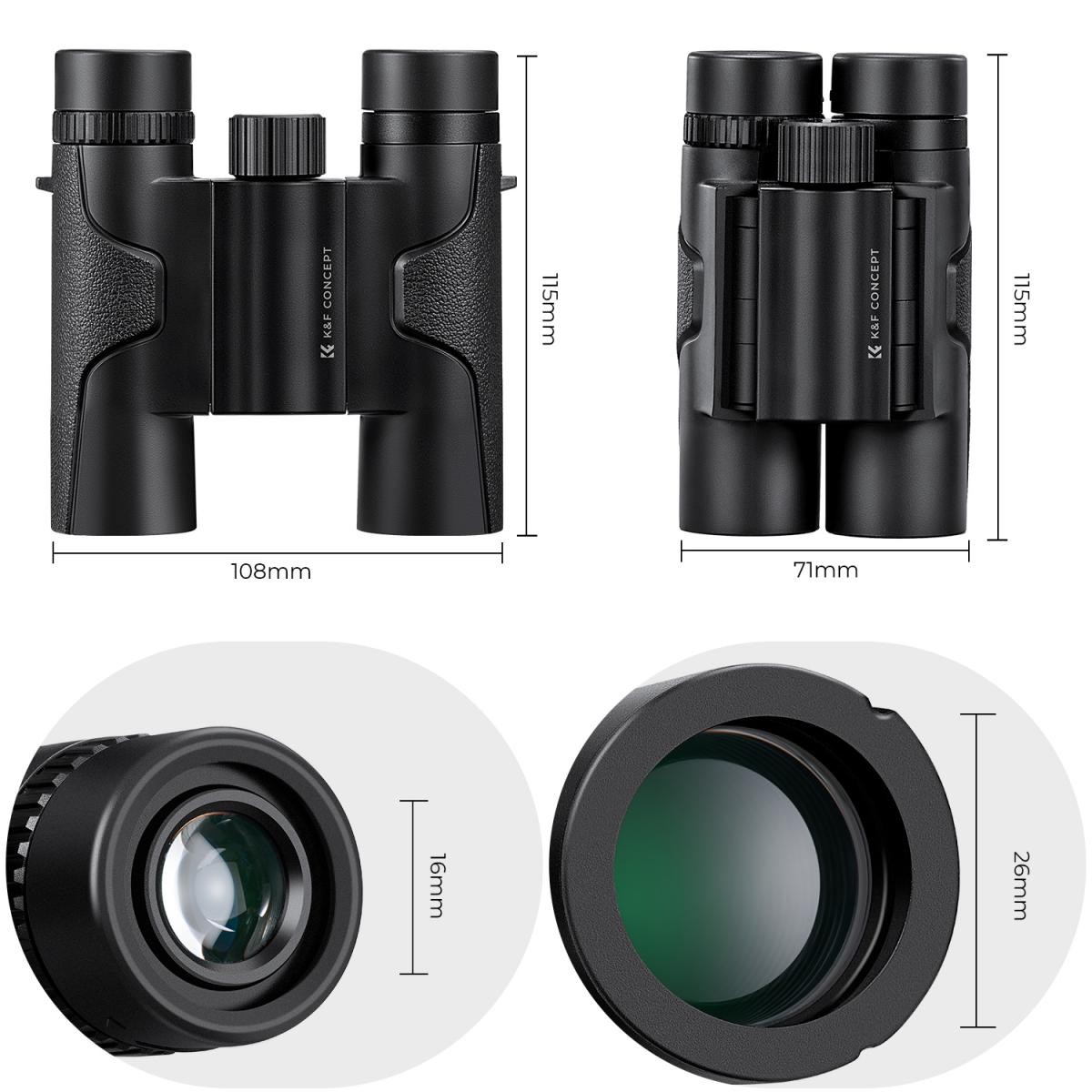 A K&F 10x25 HD távcső kompakt, könnyű kialakítású, nagy felbontású képet biztosít. BaK4 prizmákkal, 99%-os fényáteresztő képességű FMC többrétegű bevonatú lencsékkel és IP65 vízálló házzal ellátott távcső tiszta, élénk képet biztosít utazáshoz, természetmegfigyeléshez és szabadtéri tevékenységekhez, miközben hordozható és ergonómikus marad.