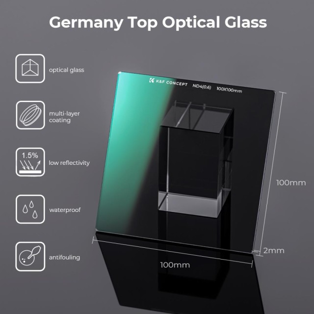 A K&F Concept 100×100×2 mm-es Nano-X Square Coated ND4 szűrő egy precíziósan megtervezett semleges sűrűségű szűrő, amelyet hosszú expozíciós idővel és nagy felbontású fényképezéshez terveztek. Kiváló minőségű AGC optikai üvegből készült, kétoldalas, 28 rétegű nano bevonattal, amely csökkenti a tükröződést és a visszaverődést, miközben minden fókusztávolságon megőrzi az élességet. Tartós, vízálló, karc- és olajálló felülete megbízható teljesítményt biztosít kihívásokkal teli környezetben, a mellékelt bőr és szivacs védőtok pedig biztonságban tartja a szűrőt szállítás közben.