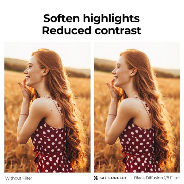 A K&F Concept Black Diffusion 1/8 Effect Filtert úgy tervezték, hogy álomszerű, filmszerű hatást hozzon létre, lágyítva a bőr tökéletlenségeit, például a ráncokat, szeplőket és pórusokat, finomabb és magával ragadóbb megjelenést eredményezve. Ideális videókészítéshez és portréfotózáshoz, fokozva a ködös filmhatást. A 28 többrétegű bevonattal ellátott szűrő a vízálló, karcálló és olajálló bevonatoknak köszönhetően könnyen tisztítható, mindezt a képminőség romlása nélkül. A japán AGC optikai üvegből készült szűrő többszörös bevonata 87%-ra csökkenti az áteresztőképességet, miközben hatékonyan minimalizálja a felületi tükröződéseket. Az egyedülálló Nanotec kettős csiszolási eljárás nagy felbontású képeket garantál 550 mm-es gyújtótávolságon belül. A 100x100mm-es méretekkel rendelkező négyzet alakú szűrő kompatibilis a legtöbb szűrőtartóval, a csomag 1 szűrőt és egy bőr szűrőtáskát tartalmaz a kényelmes tárolás érdekében.