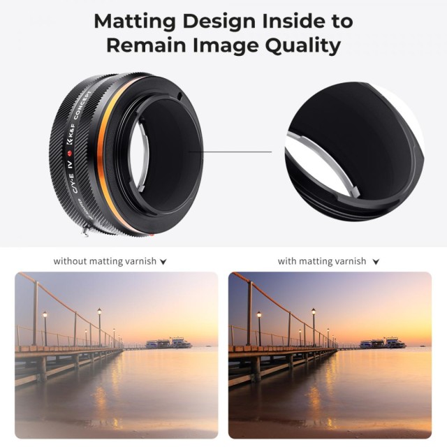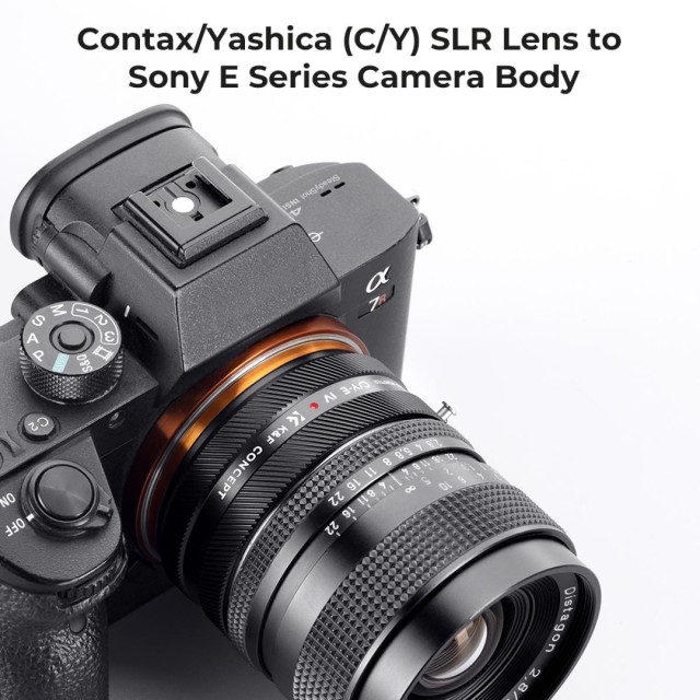 A K&F Concept C/Y-E manuális fókuszáló adapter kompatibilis aContax/Yashica (C/Y) objektívekkel, amelyek Sony E bajonettal rendelkező fényképezőgépekhez készültek.