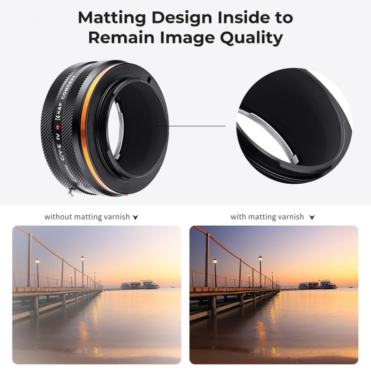 A negyedik generációs bajonett megjelenése recézett kialakítású, és a kulcsfontosságú pontok csúszásgátló bevonattal rendelkeznek, ami megkönnyíti a fogást. A finom CNC-gravírozás egyúttal növeli az esztétikai minőséget és a textúrát. A belső matt fekete bevonat csökkenti a lencsén áthaladó fény tükröződését és visszaverődését, így tökéletes, pontos expozíciójú felvételeket kaphat.