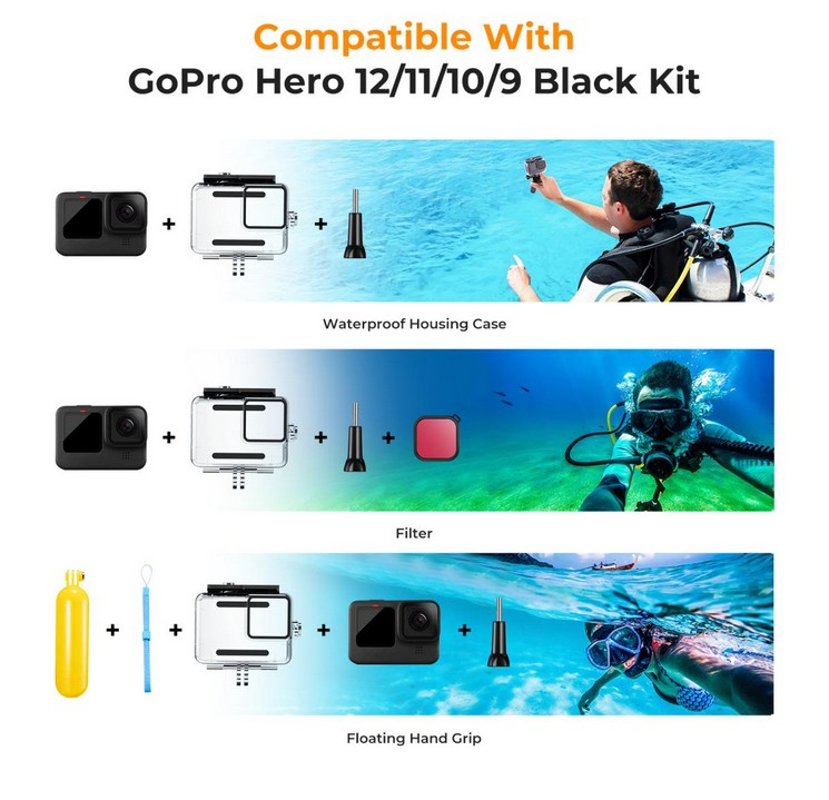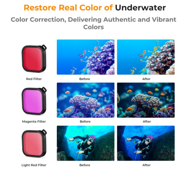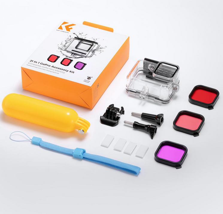 A K&F 21 az 1-ben vízálló készletet kifejezetten a GoPro Hero 12, 11, 10 és 9 Black kamerákhoz tervezték, átfogó védelmet és sokoldalú tartozékokat biztosít a víz alatti kalandokhoz. Ez a készlet tartalmaz egy vízálló tokot, amely akár 147 láb mélységet is támogat, egy sor búvárszűrőt a színkorrekcióhoz, valamint egy lebegő kézi markolatot a jobb irányítás és az elvesztés megelőzése érdekében. Biztosítja, hogy akciókamerája biztonságos és működőképes maradjon úszás, szörfözés, búvárkodás, snorkeling és egyéb vízi tevékenységek közben.