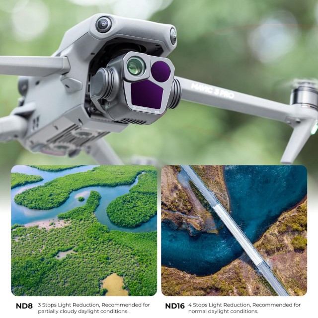 Mavic 3 Pro szűrők. CPL, ND8, ND16 szűrőkészlet kompatibilis a DJI Mavic 3 Pro-val. Importált AGC optikai üvegből készült visszaállítja a valódi színt, nincs színtévesztés, biztosítja a nagy felbontású kép megjelenítését. csökkenti a lencse tükröződését és tükröződését.