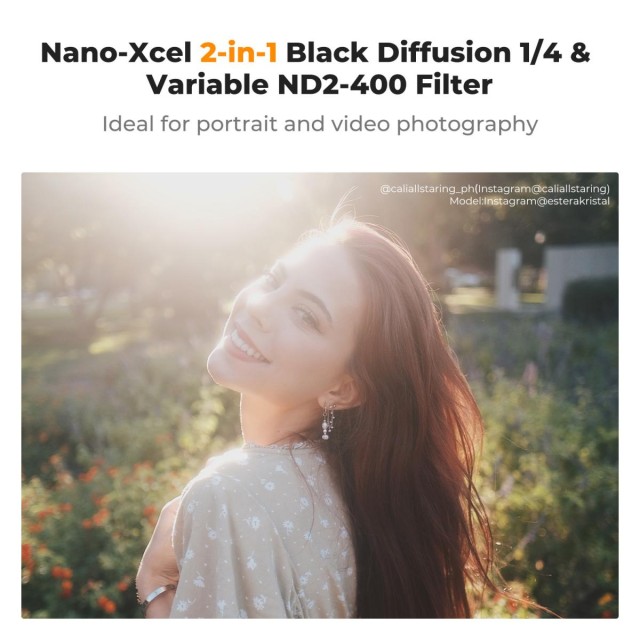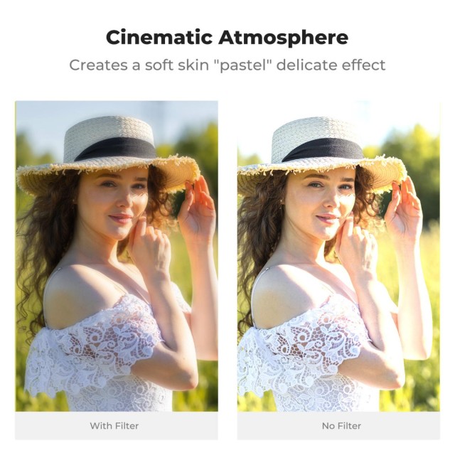 A K&F Concept 49 mm-es állítható Black Mist 1/4 és változó ND2–ND400 szűrő diffúziót és változó fénycsökkentést kombinál egyetlen, sokoldalú eszközben – ideális mind a fotósok, mind a videósok számára, akik sima expozíció-vezérlést és álomszerű, filmszerű lágy hatást keresnek.