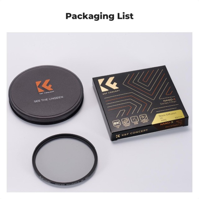 A K&F Concept Black Mist 1/4 Nano-X sorozatúszűrő lágyítja a fényvisszaverődéseket, csökkenti a kontrasztot és filmszerű hatást kölcsönöz a videóknak és fényképeknek.