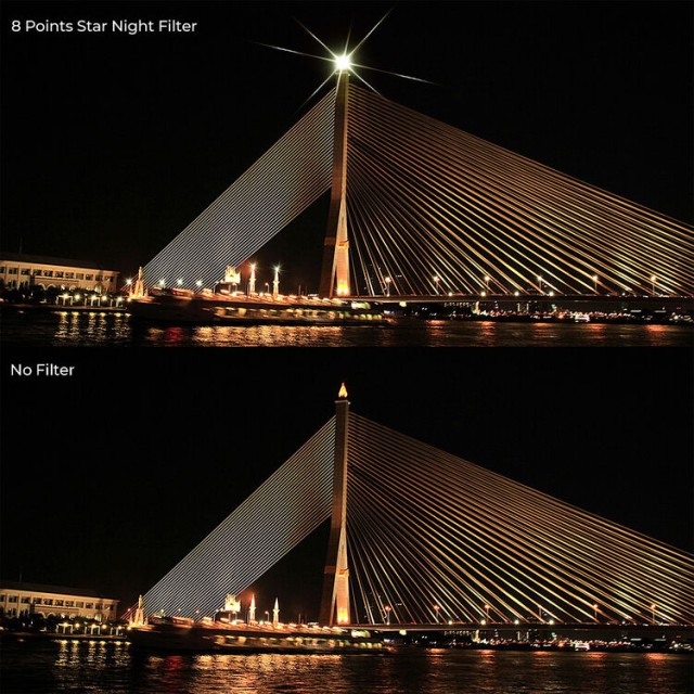 K&F Concept 55 mm-es változó csillag 4-8 szűrő: Vékony fémkeretben zöld bevonatú, többrétegű optikai üveg, simán forgatható, így pontszerű fényforrásokon testreszabható 4- vagy 8-pontos csillaghatás érhető el.