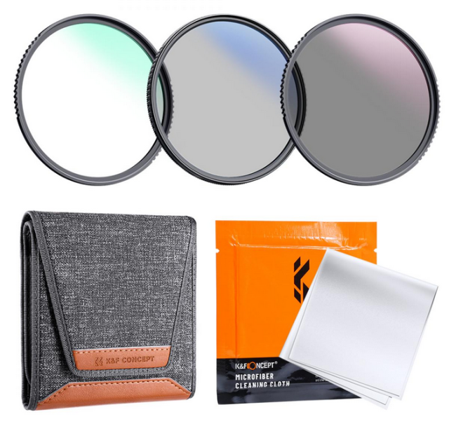 A K&F 58mm 3db professzionális objektívszűrő készlet egy sokoldalú és nélkülözhetetlen tartozékkészlet a fotósok számára, akik a fényképezés élményét szeretnék fokozni. Ez a készlet három kulcsfontosságú szűrőt tartalmaz: egy UV-szűrőt az objektív védelmére és az UV-fény csökkentésére, egy CPL (Circular Polarizer) szűrőt a tükröződések minimalizálására és a színtelítettség fokozására, valamint egy ND4 (Neutral Density) szűrőt a fényexpozíció csökkentésére és a mozgási elmosódás effektusok elérésére.