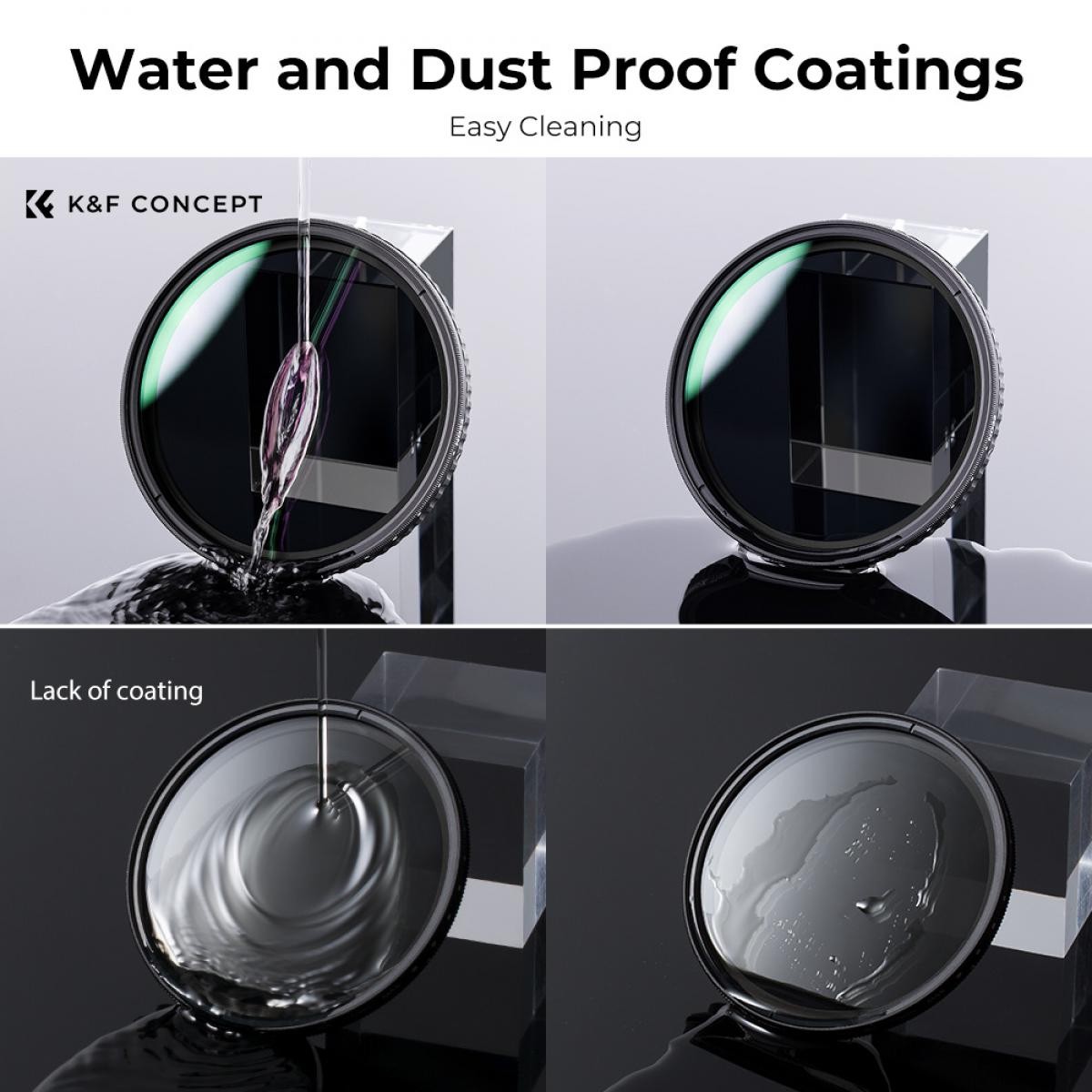 A K&F Concept 58MM Nano-X Variable/Fader ND Filter ND32–ND512 professzionális szintű expozícióvezérlést biztosít a dinamikus fényviszonyok között dolgozó fotósok és videósok számára. A színek pontosságának megváltoztatása nélkül csökkenti a lencsébe belépő fény mennyiségét, így ez a változó ND szűrő ideális hosszú expozíciókhoz, selymes vízeffektusokhoz, mozgáselmosáshoz, tájfotózáshoz és videofelvételekhez. A fejlett no–X-cross technológiával a szűrő kiküszöböli a sok változó ND szűrőben látható általános „X” mintázatot, így biztosítva a tiszta, egyenletes eredményeket a beállítási tartomány egészében. A pontos, önzáró ND32 és ND512 állások megakadályozzák a véletlen túlforgatást.