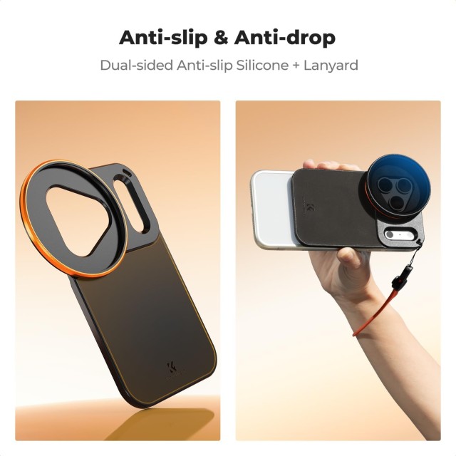 A biztonság és a kényelem érdekében a tartó csúszásgátló szilikon párnákkal, ütéscsillapító kerettel, zsinórlyukkal és mellékelt zsinórral rendelkezik, hogy megakadályozza a leesést. A hálós zsebekkel és rugalmas pántokkal ellátott, többfunkciós, matt EVA tárolótáska gondoskodik a mágneses tartó és a szűrők rendezettségéről és védelméről, míg a kompakt méretek (16×11×4,5 cm) megkönnyítik más kiegészítőkkel együtt történő szállítását. Az optimális teljesítményt csupasz iPhone-on használva éri el; az Apple hivatalos tokjaival való korlátozott használat a mellékelt mágneses gyűrűvel támogatott.