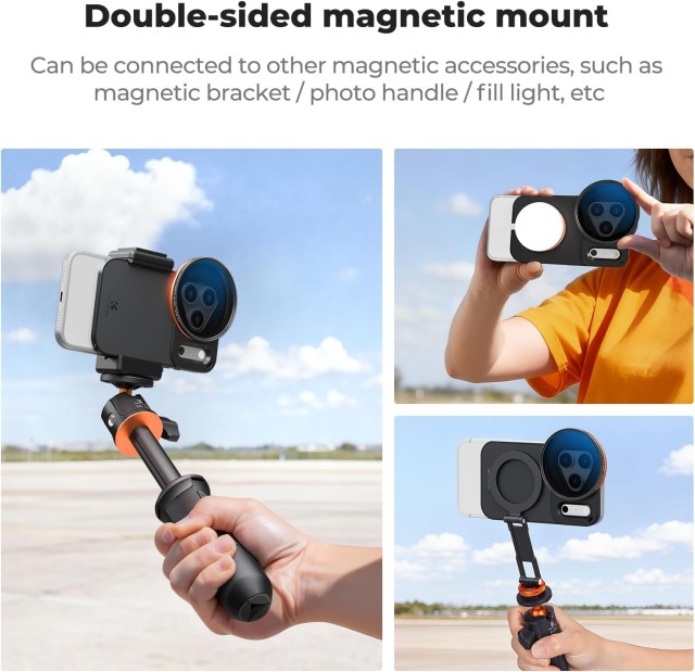 A K&F 58 mm-es csavarozható iPhone Magsafe kétoldalas mágneses szűrőtartó az iPhone 17 Pro Max készülékhez precíz illeszkedést, erős kétoldalas mágneseket biztosít, és támogatja az 58 mm-es szűrőket, beleértve a mellékelt VND szűrőt is. Átfogó védelmet és hordozható tárolást biztosít, így stabil, biztonságos és sokoldalú mobil fotózást tesz lehetővé.