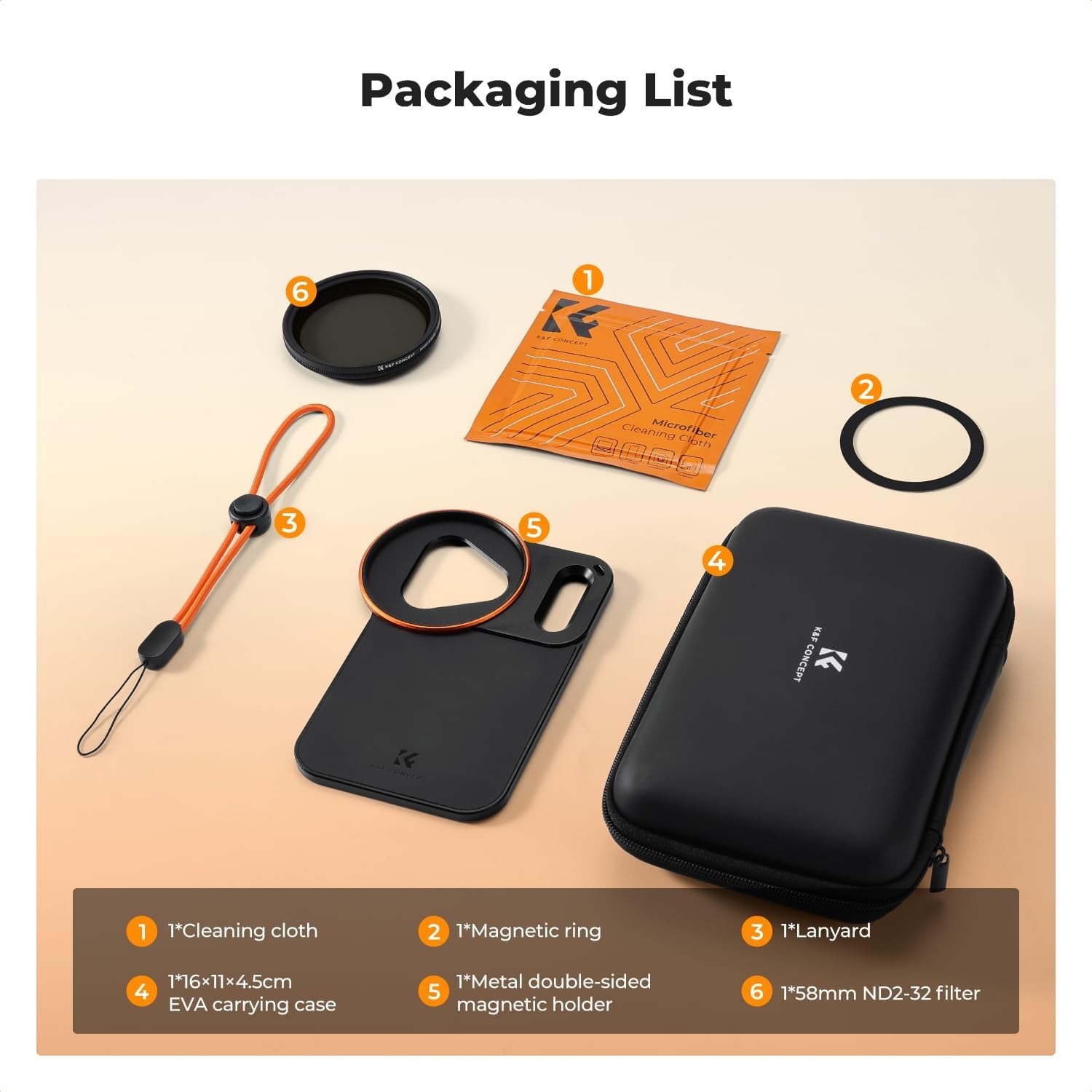 A K&F 58 mm-es csavarozható iPhone Magsafe kétoldalas mágneses szűrőtartó az iPhone 17 Pro Max készülékhez precíz illeszkedést, erős kétoldalas mágneseket biztosít, és támogatja az 58 mm-es szűrőket, beleértve a mellékelt VND szűrőt is. Átfogó védelmet és hordozható tárolást biztosít, így stabil, biztonságos és sokoldalú mobil fotózást tesz…