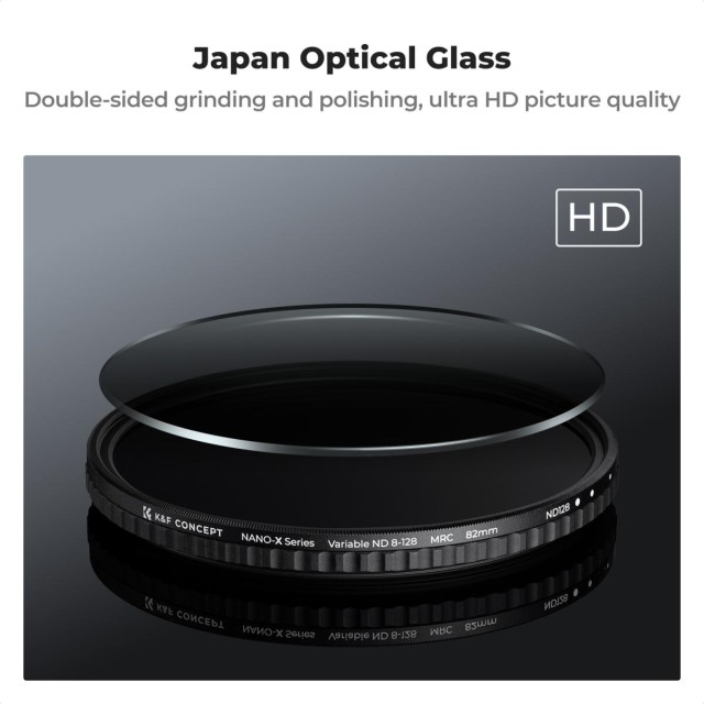 K&F Concept 58 mm Nano-X változó ND8-ND128 szűrő: AGC üveg, 35 rétegű nano-bevonat, nincs „X” kereszt, ultra-vékony 7,4 mm-es keret 3–7 fokozatú tiszta fényvezérléshez.