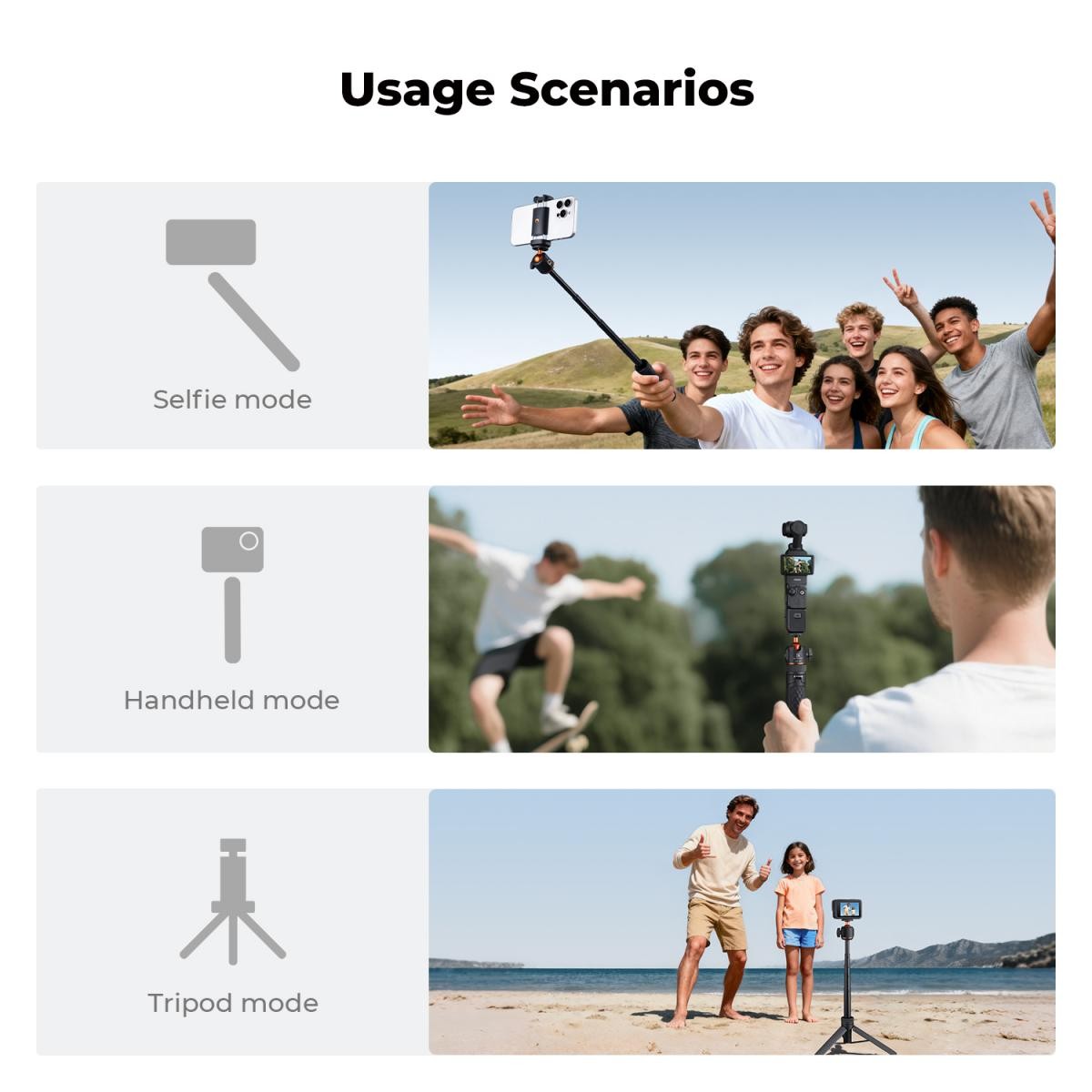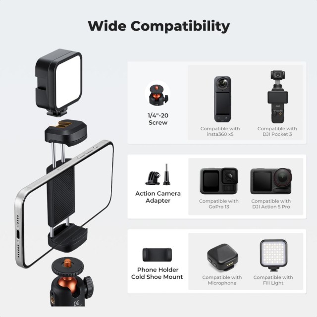 A tartófején szabványos 1/4" csavarmenettel rendelkezik, amely kompatibilis a Canon és Sony márkájú kompakt fényképezőgépekkel. Tartalmaz adaptereket akciókamerákhoz és telefon tartókat, így ideális a DJI Pocket 3, GoPro, DJI Osmo Action, Insta360, okostelefonok és más eszközök használatához.