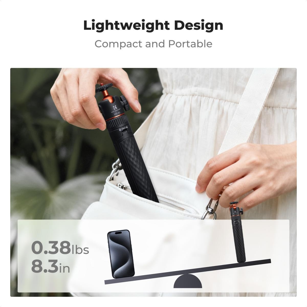 Az asztali állvány súlya mindössze175 g, összecsukott állapotban pedig csak 21 cm. Elég kompakt ahhoz, hogy könnyen elférjen egy táskában, hátizsákban vagy akár zsebben is, így utazás közben is használható.