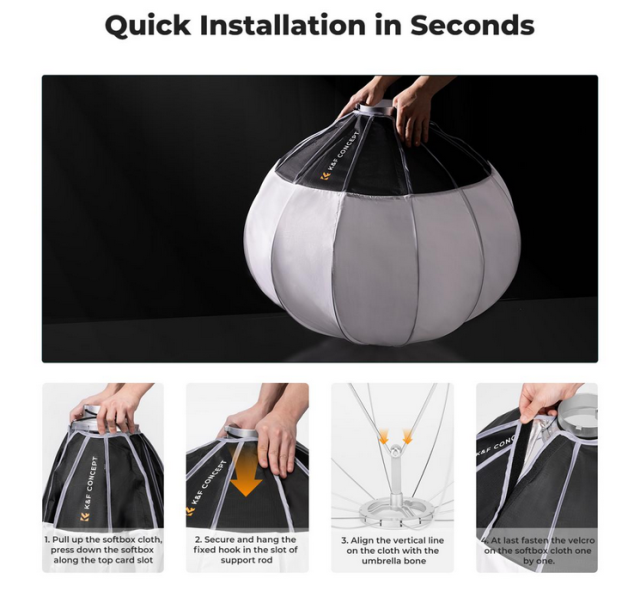 A K&F 65CM Lantern Soft Light Box segítségével egyenletes, 360°-os lágy megvilágítást érhet el, amely ideális a stúdióban való használathoz. Tökéletes a fotósok és filmesek számára, akiknek hatékony és hordozható világítási megoldásokra van szükségük.