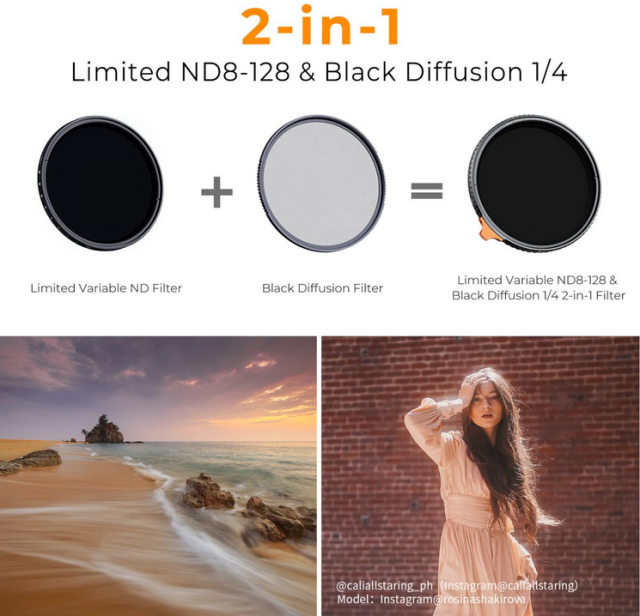A K&F 82MM multifunkciós szűrő egyetlen szűrőben egyesíti az ND8-128 és a Black Mist 1/4 funkciókat, így fénycsökkentő és ködhatást is kínál. A 7,4 mm vékony keret kialakítása és a CNC trapéz alakú mintázat biztosítja a vignettálás nélküli könnyű felszerelést és eltávolítást. A repülési minőségű alumíniumból készült szűrő kétoldalas, 28 rétegű tükröződésgátló bevonattal rendelkezik, amely 84%-os fényáteresztő képességet biztosít, fenntartva a nagy felbontású képalkotást. A szűrő 3-7 f-stop beállítását teszi lehetővé, és a tartósság érdekében penészgátló, vízálló, karcolásgátló és olajmentes bevonatot tartalmaz.